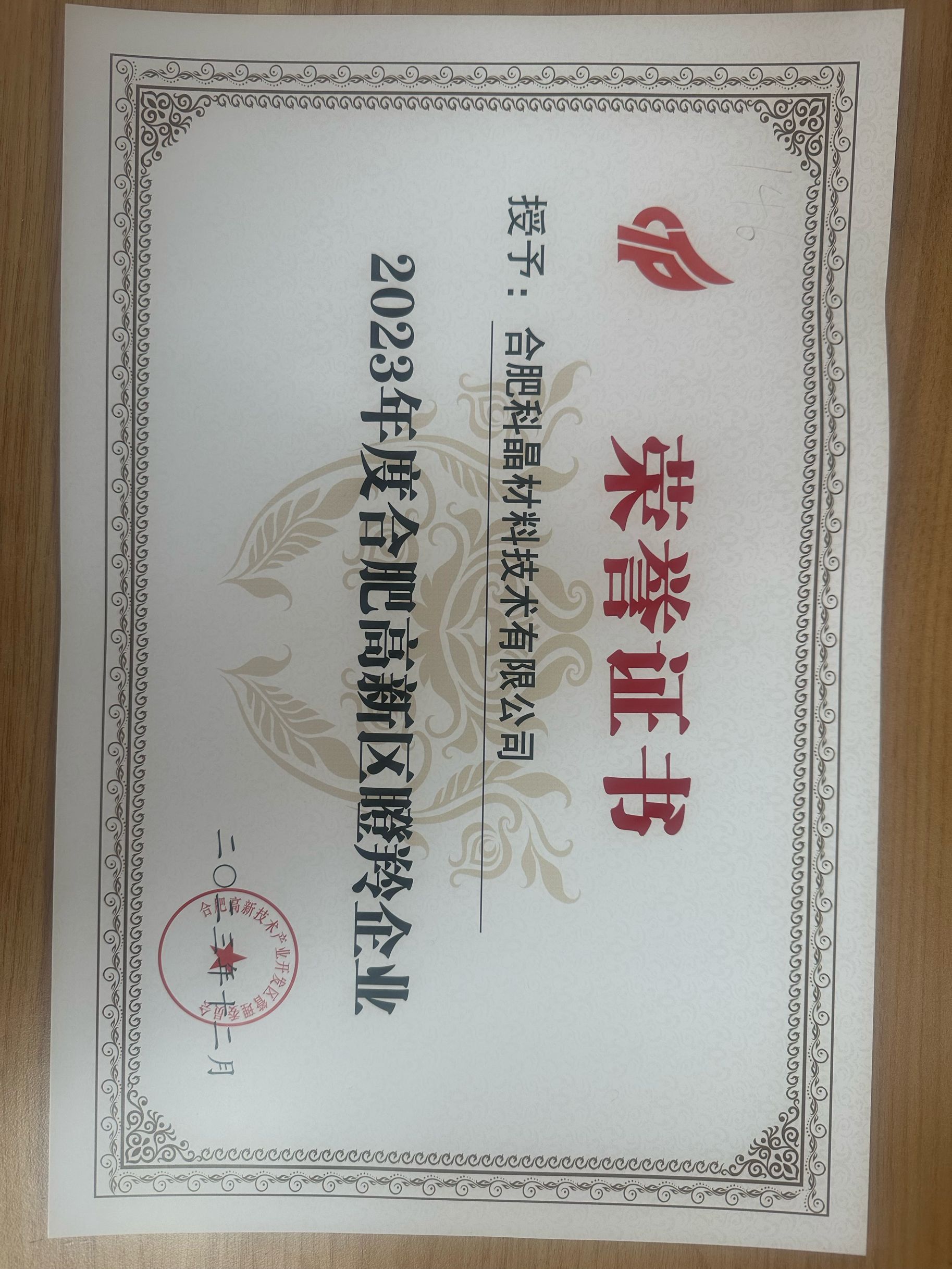 合肥科晶榮獲2023年度合肥高新區瞪羚企業