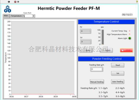 PC控制 | · 電源箱上安裝有通訊接口可與電腦相連接,可在軟件中設置設備的送料速度以及加熱程序 · 界面上直觀顯示溫度曲線 · 裝置分為自動送料與手動送料兩種方式 · 手動送料:點擊界面上的“手動送料”,裝置開始送料,3分鐘后停止送料,所送物料重量約為0.2g · 自動送料:有6種送料速度的方案,在“送料速度”框內輸入1-6任意一數值,點擊“Set”即可確定對應數值的送料速度,如輸入數值為“2”,則送料速度為2-4g/h |