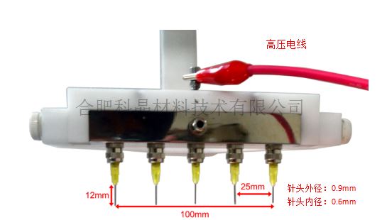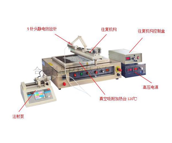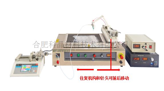 紡絲噴頭和往復機構 | ·5針頭靜電針頭安裝在往復機構的支架上 ·每個針頭之間的距離:25mm ·針頭安裝在往復機構上可左右移動 范圍為:50-270mm(可調節) |