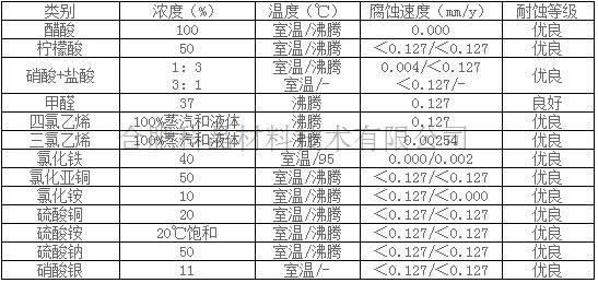 耐腐蝕性 | ·鈦合金法蘭在硝酸、硫酸、堿液、氯氣和有機(jī)介質(zhì)(汽油、甲苯、甲醛、苯酚、醋酸、三氯乙烷、檸檬酸、一氯代醋酸)環(huán)境中具有較高的耐腐蝕性 ·以下表格是鈦在各類環(huán)境中的腐蝕性,此表格僅供參考: |
