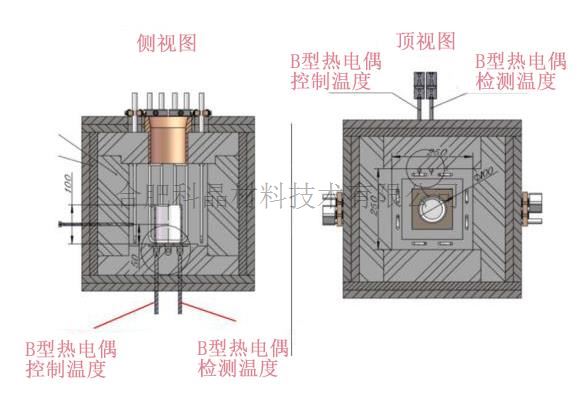加熱腔體 | ·腔體尺寸:280mm×280mm×210mm ·加熱元件:1800級硅鉬棒(8根U型硅鉬在腔體四周,3根直棒在腔體底部) ·腔體四周加熱和底部加熱分別獨立控制,用于調(diào)節(jié)適合的溫度梯度 ·4根B型熱電偶,2根熱偶用于溫度控制,2根熱偶用于溫度檢測 ·可移動頂部蓋板上有一個直徑Φ20mm的孔洞,便于操作 ·一個直徑為Φ16mm的氧化鋁管嵌入在腔體上,用于觀察晶體生長過程 |