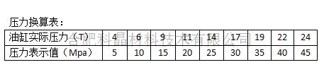 油缸壓力換算 | ·注:對照表為實測數據,如需其他壓力值,可參考本公司推算的計算公式。 油缸壓力(T)=壓力表示值(MPa)* 系數 0.55 |
