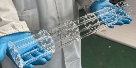 爐管與進氣管 | · 設備標配一根異形的石英管,在長度1200mm處垂直向下 · 石英管尺寸:外徑80*壁厚3*長1200/1000mm · 法蘭的進氣口內部安裝了一個單端開口,石英材質的進氣管,尺寸:外徑8*壁厚1.5*長180mm。進氣管末端有一些通孔,使氣體能分散噴出 · 在氣體預熱爐爐膛內安裝了一個多孔石英擋板,有六層,每層間隔80mm,總尺寸:φ70*404mm。多孔石英擋板能減緩氣體在爐管內的流動,使氣體能充分加熱 |