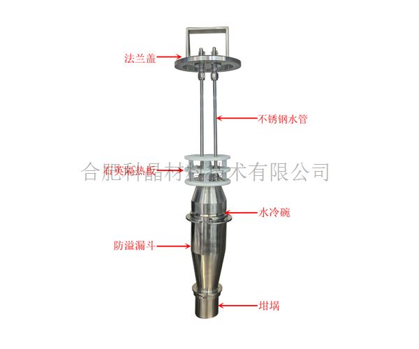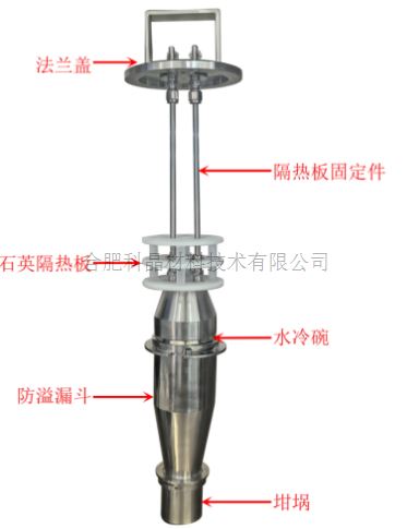 坩堝組件 | · 設備中標配一個放料坩堝,尺寸:φ50*50mm,坩堝放置一個坩堝支架上 · 坩堝上方位置安裝了一個防溢漏斗,旋轉坩堝即可將坩堝裝入漏斗卡槽內 · 漏斗上方安裝了一個φ68mm的水冷碗,鈦合金材質,利用卡槽的方式連接。水冷碗有兩根空心的不銹鋼管固定在法蘭上,法蘭安裝有水管接口,利用編織軟管將冷卻水通入到水冷碗,進行循環冷卻,編織軟管通過饋通引出手套箱外與水冷設備連接 · 實驗時,坩堝內的物料因高溫蒸發,又因水冷碗的低溫快速凝聚,然后沿著漏斗重新收集到坩堝內 · 一個三層的石英隔熱板穿在隔熱板固定件上,石英板尺寸:φ96*55mm(OP材料),可以很好的隔絕爐內額外熱量散入手套箱 |