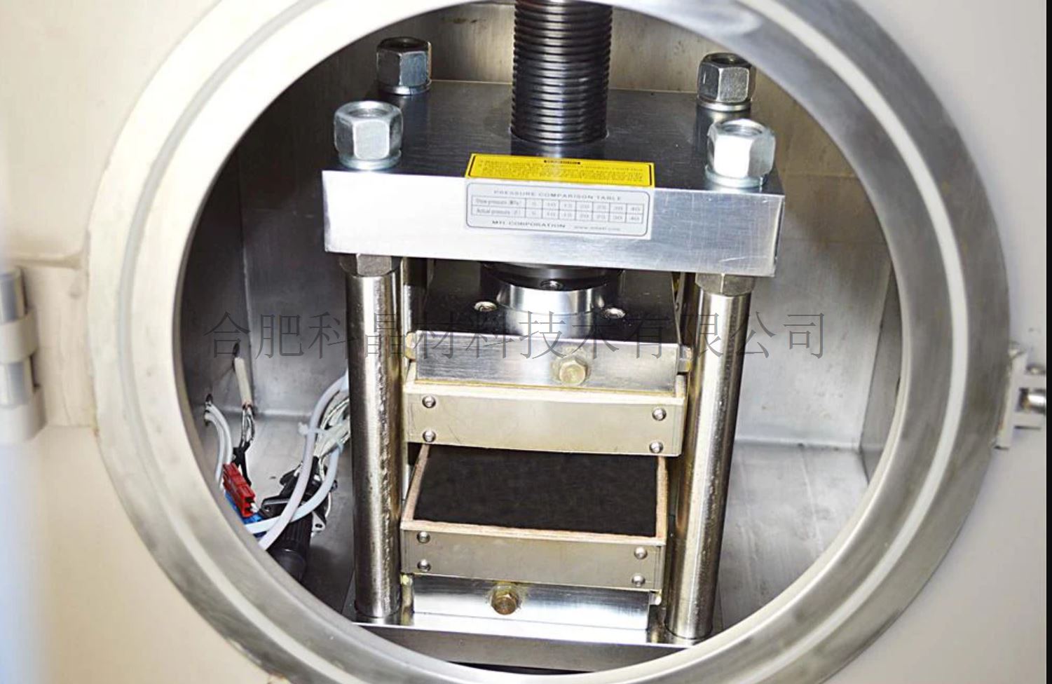 ·電動液壓機和加熱板被放置在真空室內部 ·真空室由 SS304 不銹鋼制成 ·安裝有一個真空密封門,直徑300mm,有一個直徑150mm的石英窗口,便于裝樣品和觀察 ·所有真空密封均使用硅橡膠 O 型圈 ·可選購安裝了一個數字真空計(10E-4Torr)測量真空腔室的真空度